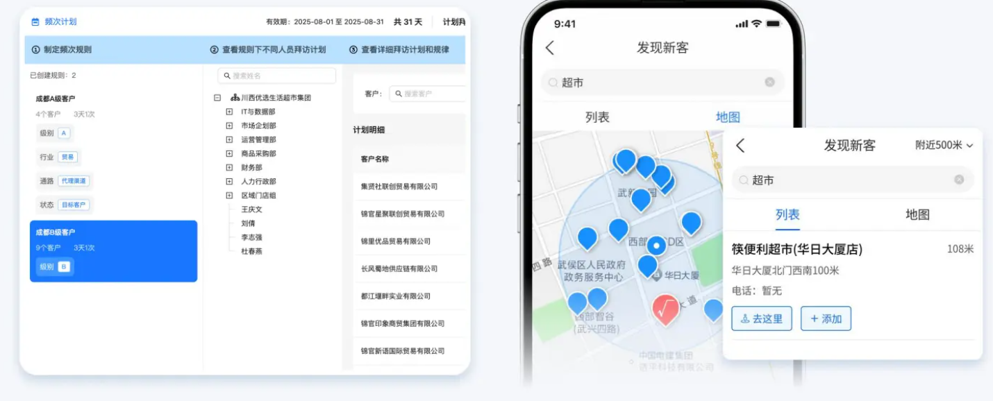 最短拜访路线规划:系统基于 LBS 技术,自动为督导规划当天的最优顺序。据统计,单人日均拜访量通常可提升 20% 以上。