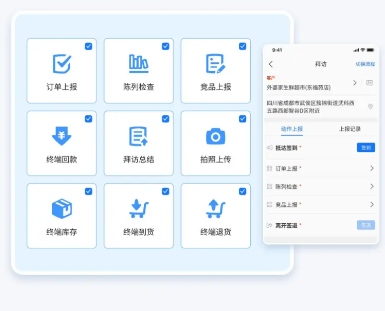 应用场景:所有销售人员必须通过系统进行考勤与客户信息记录,系统自动生成拜访详情。