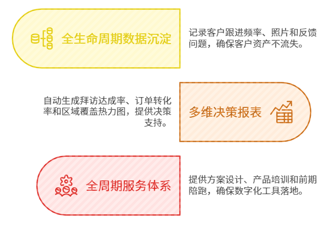 全生命周期数据沉淀:每一个客户的跟进频率、历次照片、反馈问题都会被完整记录。即使人员离职,新员工通过小步外勤也能无缝衔接,客户资产不流失。