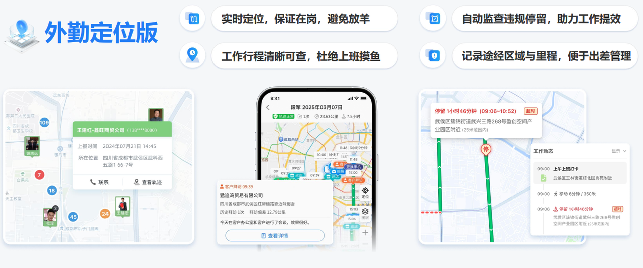 - 痛点:外勤销售“将在外,君命有所不受”,无法核实是否真的跑了市场。
