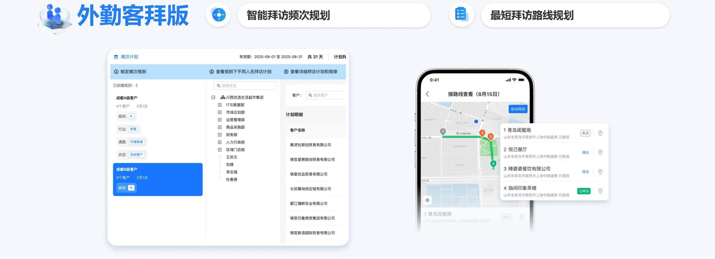 最短路径规划:签退后,系统根据当前位置自动推荐下一个最优拜访点。
