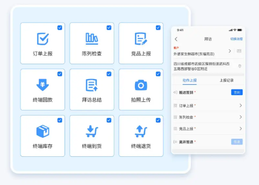 动作流指引:业务员进店后,系统自动弹出预设的拜访任务。