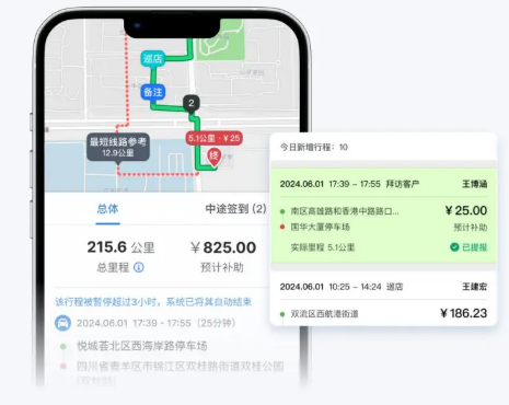 开车报销版:自动记录外勤过程中的行车轨迹,精准核算油费补助。系统能识别虚报里程和异常偏移,直接为企业节省大量的运营费用。
