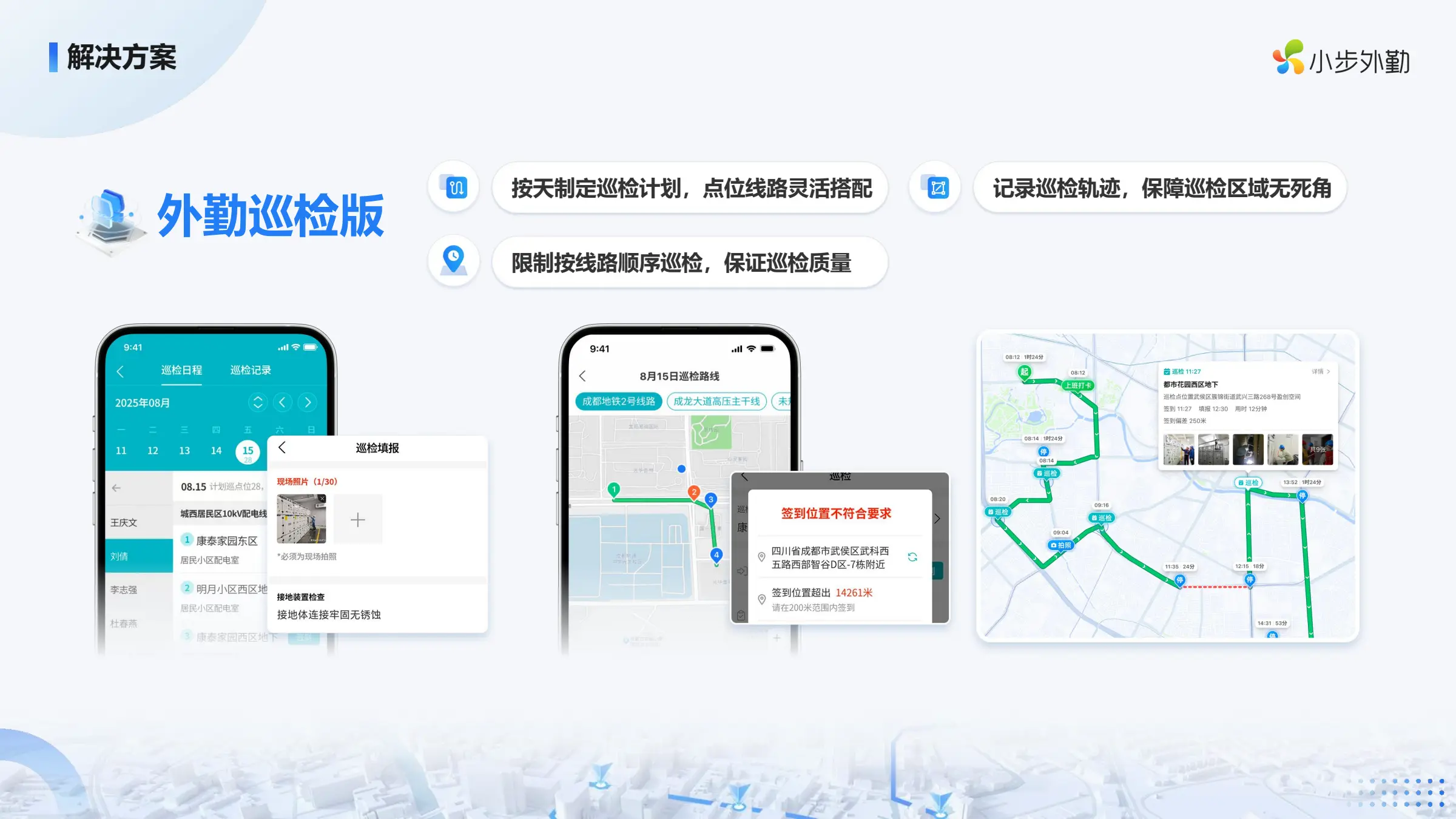作为国内领先的外勤人效费控优质服务商,小步外勤始终坚持以“保真实”为底座。在巡检管理中,它并非简单的定位工具,而是构建了一套严密的防作弊防御体系。