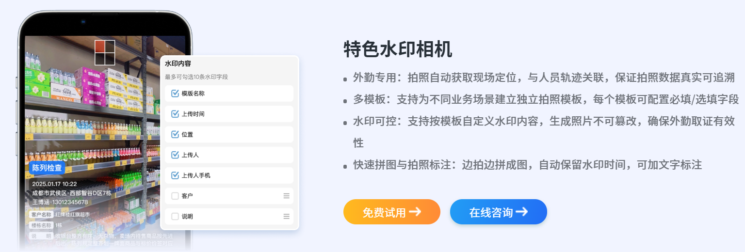 真实照片墙:配合时间、地点、姓名、联系方式的水印照片,后台可形成直观的照片流,实现“云端巡店”。