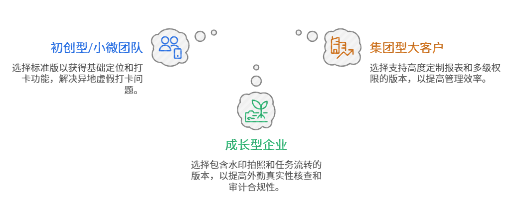 初创型/小微团队:建议选择包含基础定位和打卡功能的标准版。重点关注小步外勤的移动考勤功能,解决员工“异地虚假打卡”的痛点,用极少的投入换取立竿见影的纪律提升。