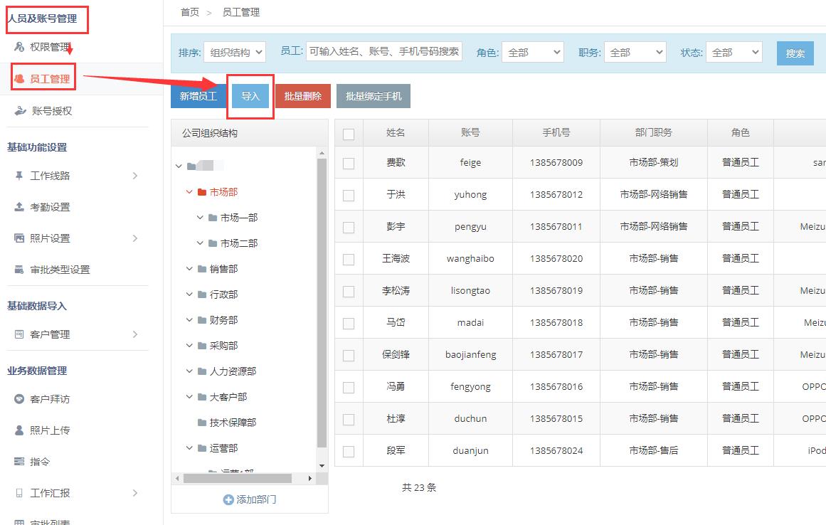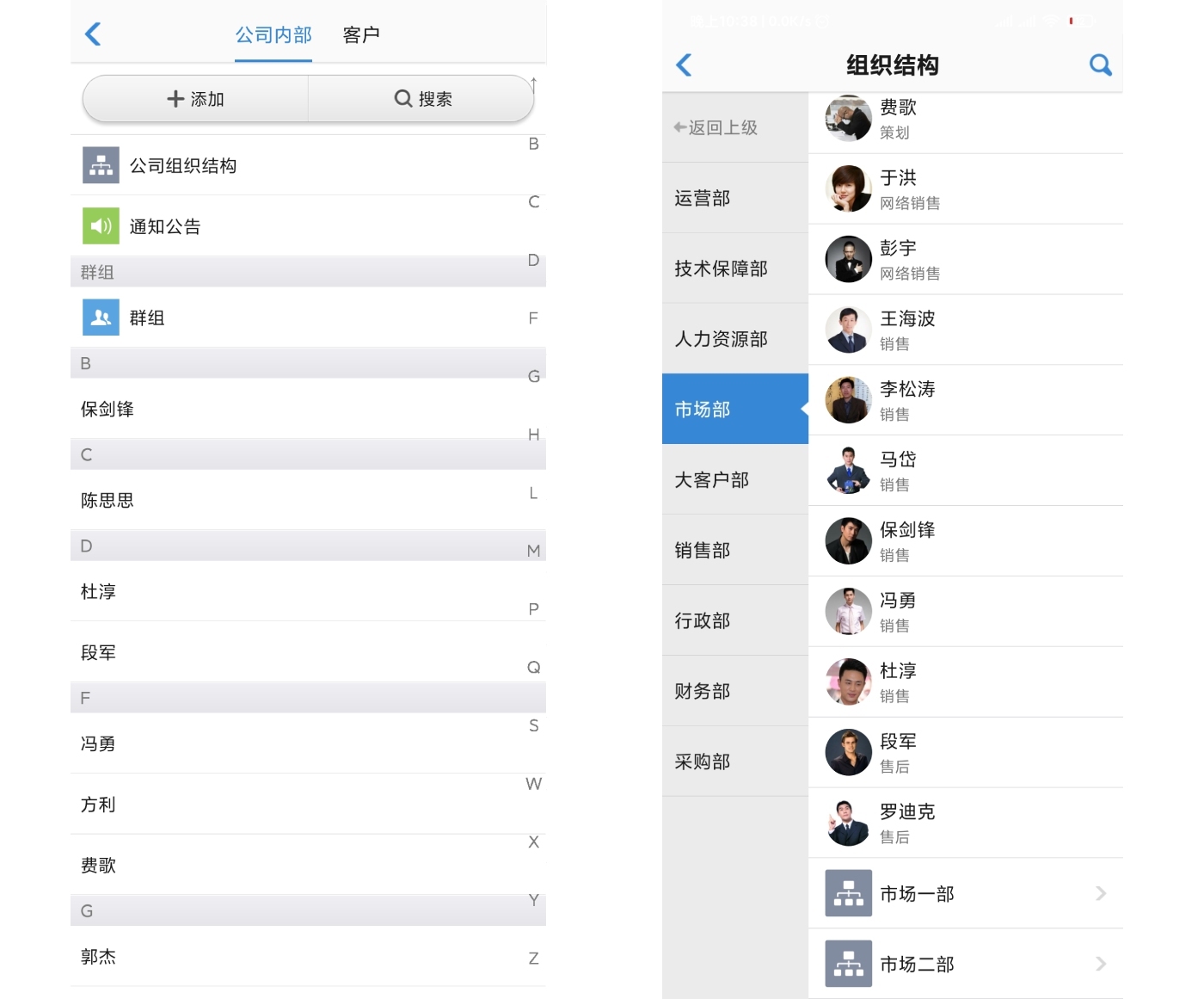 公司组织结构建立完成,手机端可按组织结构,查看所有人员。