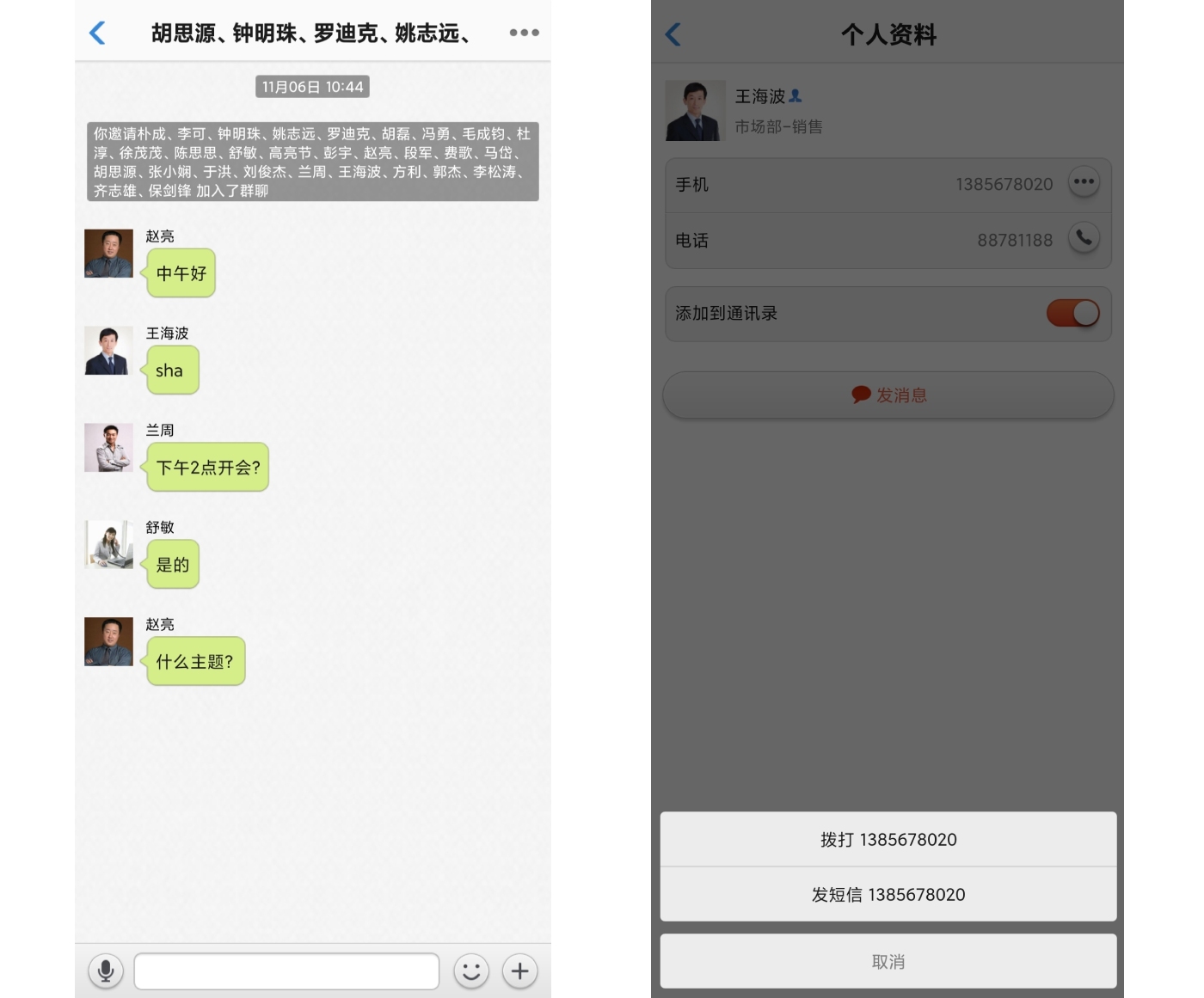 点击选择某位人员,可直接沟通,也可建立或拉入群聊,使内部沟通畅通无阻,极大提高管理效率。
