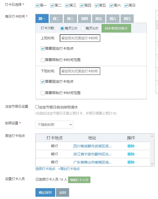 1、通过考勤功能,可设置多个考勤点,即时外勤员工每天上班地点不一样,也能满足每位员工的正常打卡需要。