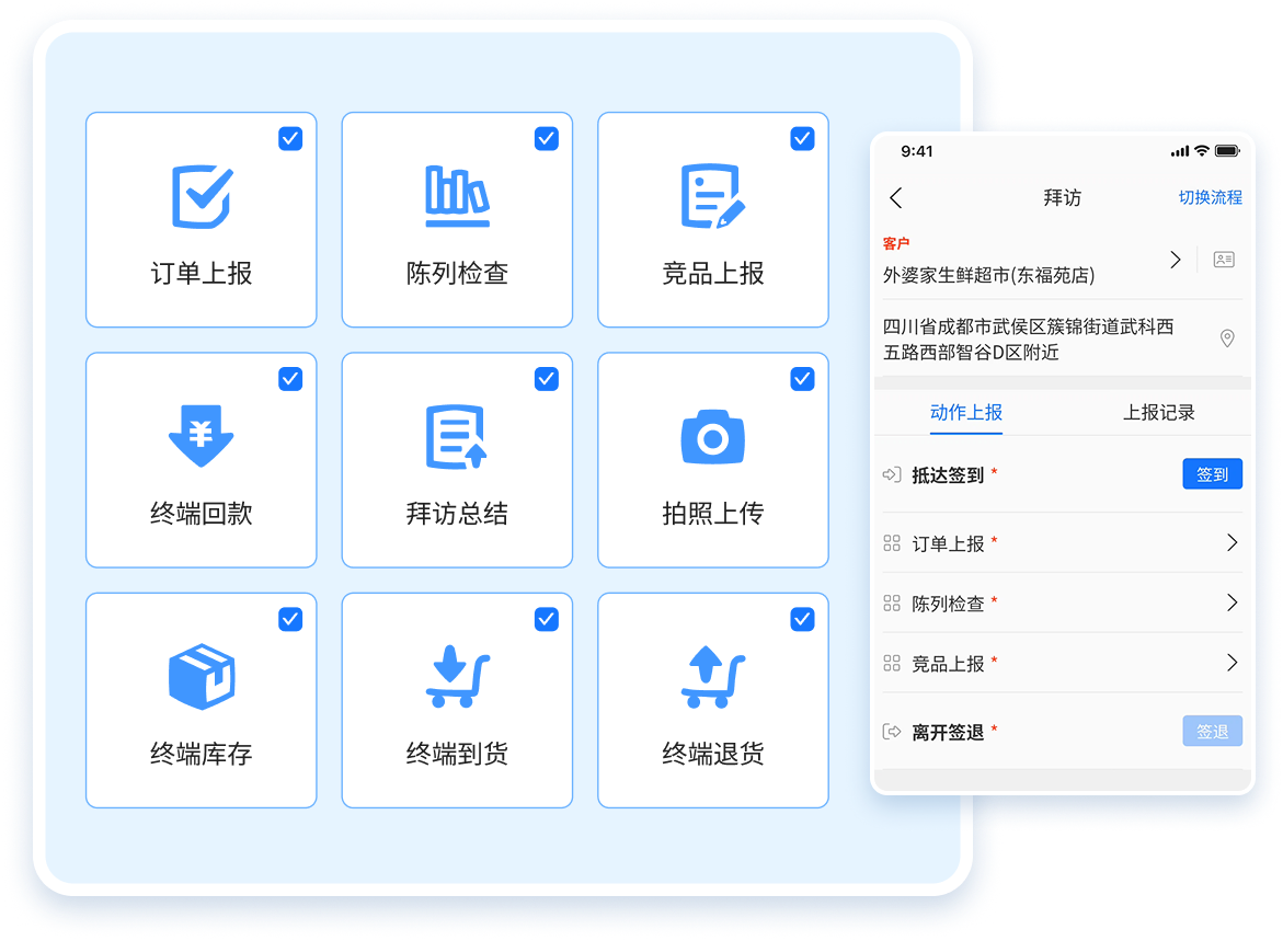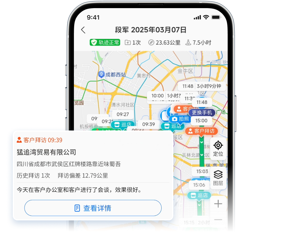 通过小步外勤的客户拜访版块,可以实现客户拜访一键签到,并且需要将拜访的详情上传至系统,系统会自动判断拜访是否有偏差,助力员工快速判断员工工作饱和度。
