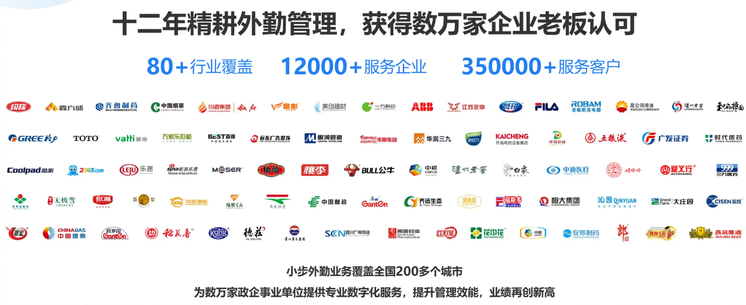 小步外勤已服务 80 多个行业,累计为 12,000 多家企业提供数字化巡店方案: