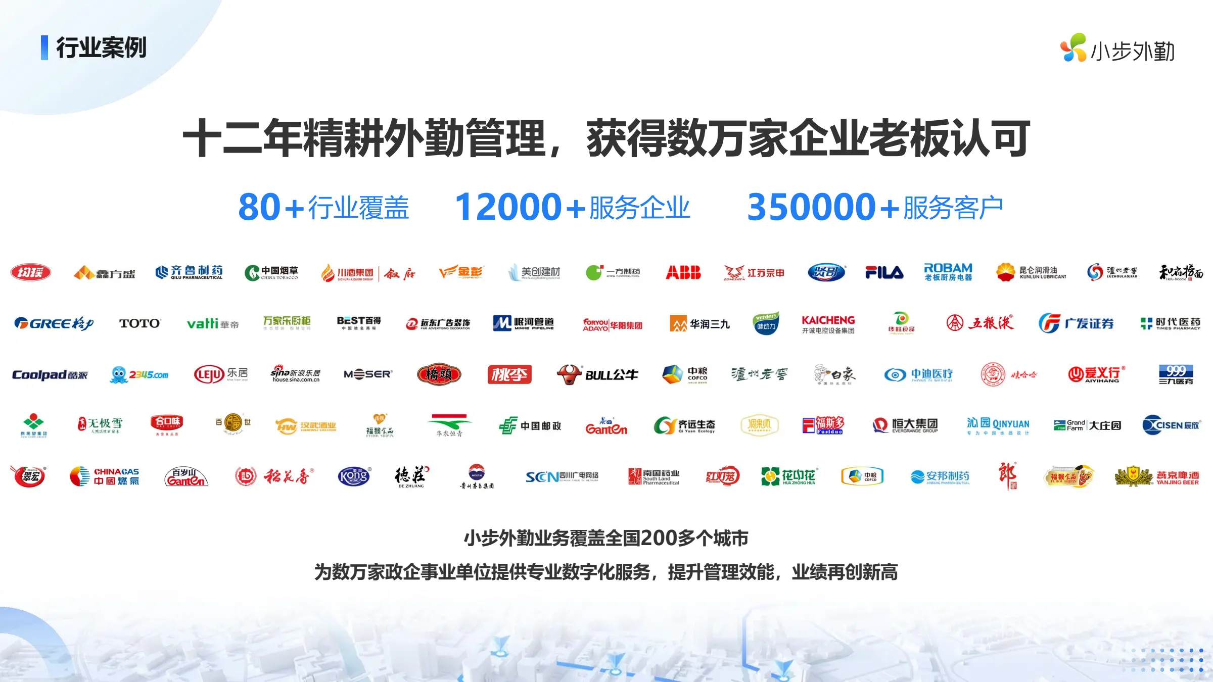 小步外勤成立于2012年,是国家认证的“专精特新”企业及四川省高新技术企业。拥有30多项国家专利技术的小步,服务过包括中国石油、公牛集团、桃李食品等在内的12000多家标杆企业。这意味着中小企业可以以极具竞争力的价格,享受到与行业龙头同级别的专业管理方案。