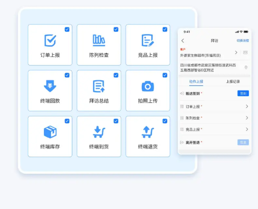 多维任务模板:支持陈列检查、竞品上报、订单上报、终端库存盘点等。业务员进店后,系统自动引导其按顺序完成各项动作,确保执行质量不走样。