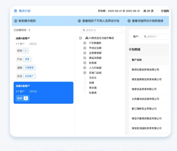 智能频次规划:根据客户等级(A/B/C 类)自动匹配拜访频率,并自动推送到人员日程,确保核心客户始终处于品牌的强关注下。