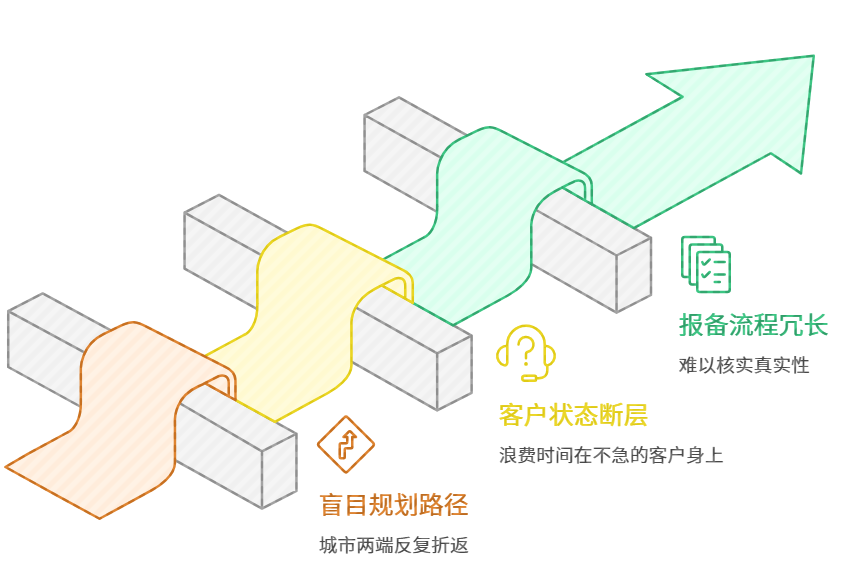 盲目规划路径:业务员习惯凭借记忆和个人喜好安排拜访顺序,导致在城市两端反复折返,不仅浪费油费,更消耗精力。
