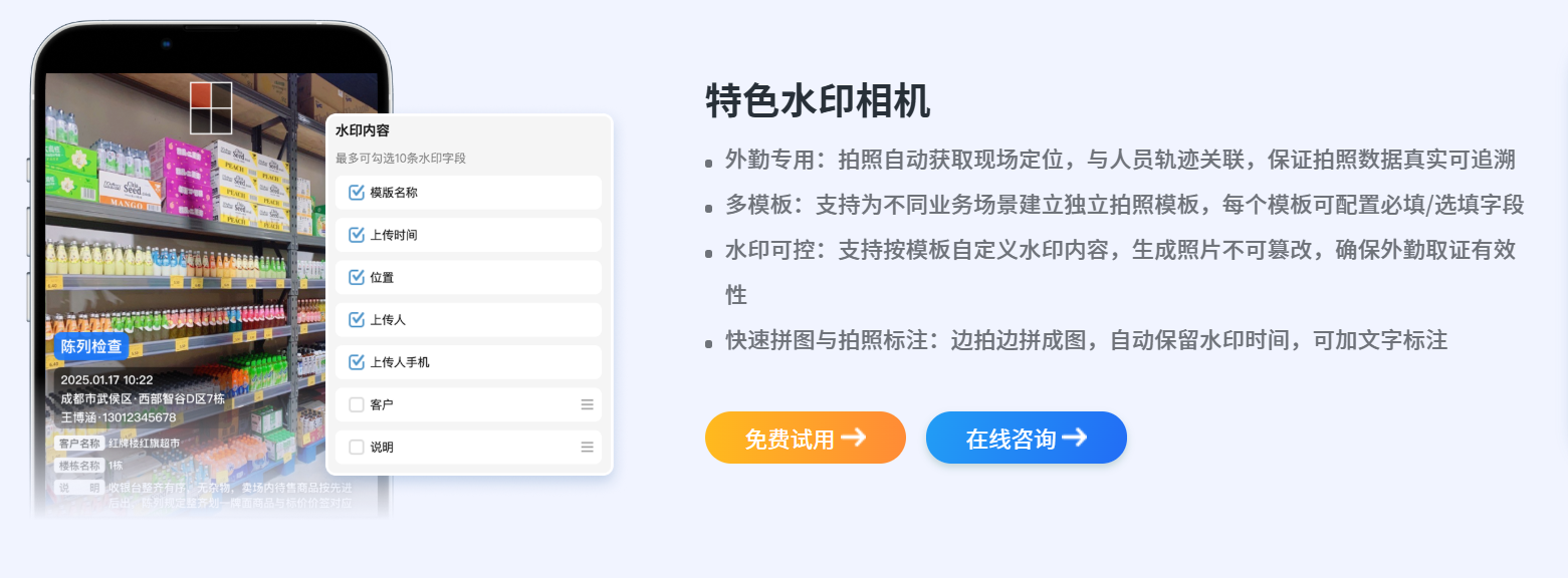 姓名与联系方式:明确责任归属,方便管理者在后台审阅照片时能瞬间锁定责任人并在必要时一键联系。 这种去繁就简的设计,让管理者能以极高的效率批量审阅外勤动态,不再被冗余数据干扰判断。