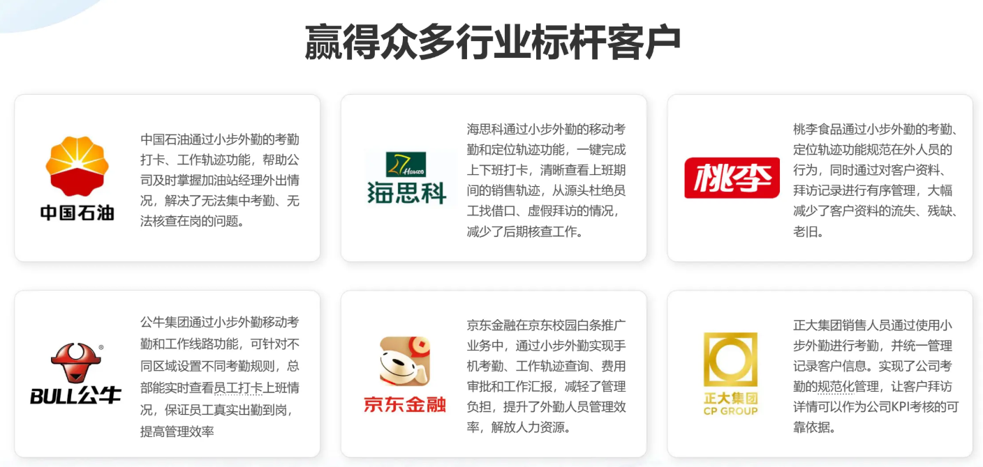 一个好的系统必须经得起行业龙头的检验。小步外勤已服务超过12,000家企业,包括中国石油、公牛集团、桃李食品、齐鲁制药、娃哈哈等标杆客户。这意味着系统已经过数百万次场景磨合,流程极其贴合实战。