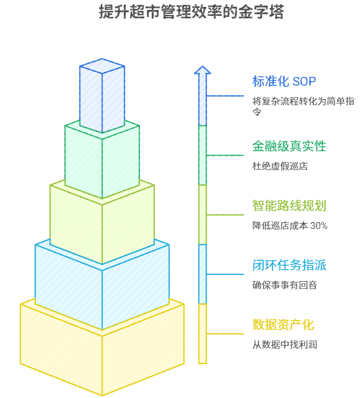 现在超市巡店系统已不再是简单的拍照工具,而是一套集“提人效、降费用、保真实”于一体的效率引擎。通过数字化巡店,企业可以将繁琐的线下行为转化为可量化、可审计的数据,从而实现从“感性管理”到“理性决策”的跨越。