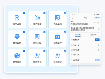 动作上报模板:包括陈列检查、竞品上报、订单录入、库存盘点等。督导只需按照预设模版进行拍照上传,系统便能自动归档。