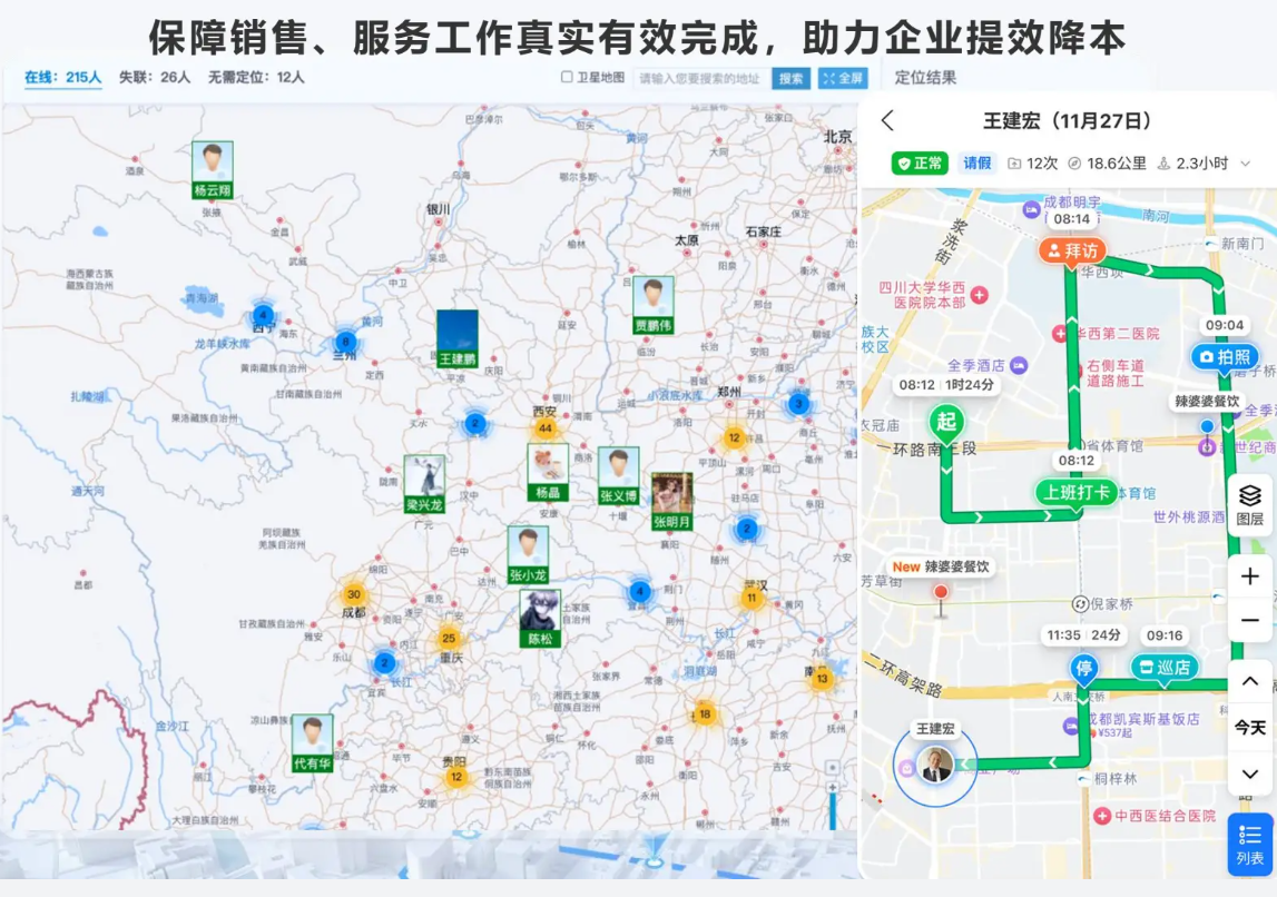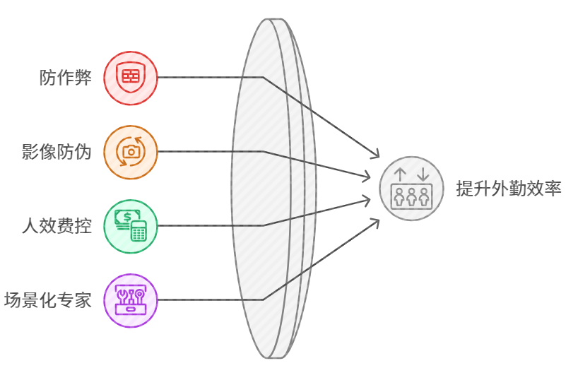 人效费控一体化:不仅管动作,更管费用。其“开车报销版”基于真实轨迹自动计算里程,剔除私事行程,平均能为企业节省15%-30%的运营开支。