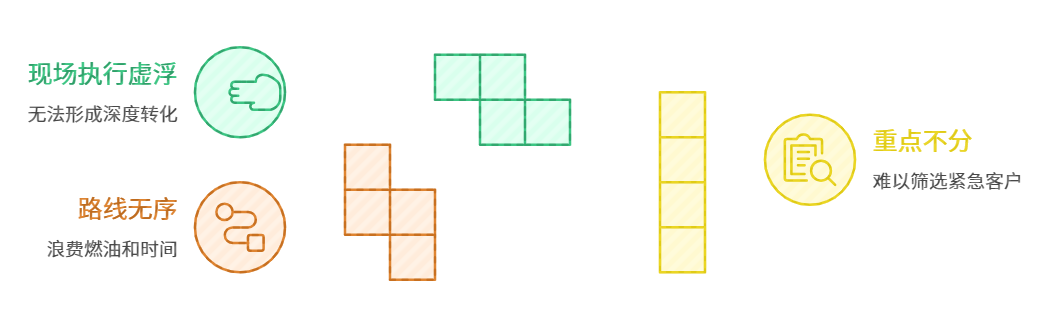路线无序:销售人员随性规划行程,经常出现从城东跑到城西、再折返回城东的情况,燃油费与时间成本极度浪费。