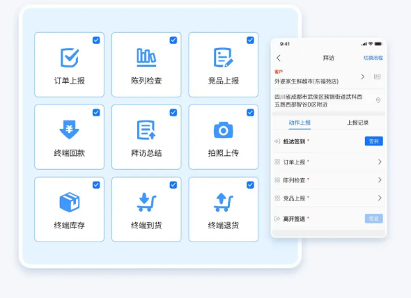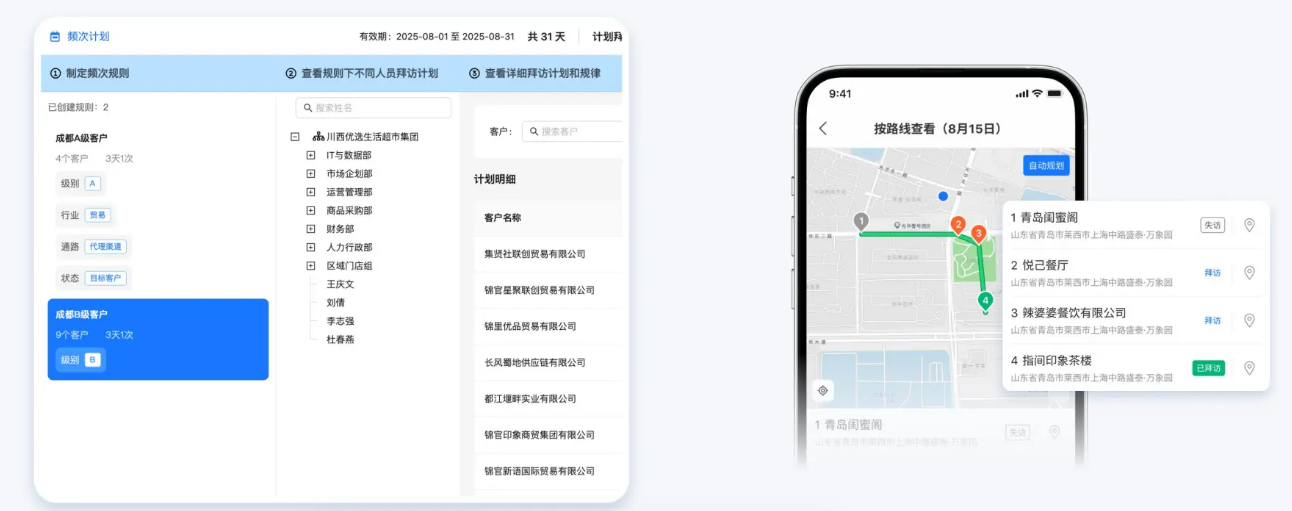 最短拜访路线规划:系统基于 LBS 技术,自动为督导规划当天的最优巡视路径,避免重叠与往返跑路。据标杆客户实测,引入后人均日拜访量通常可提升 20% 以上。