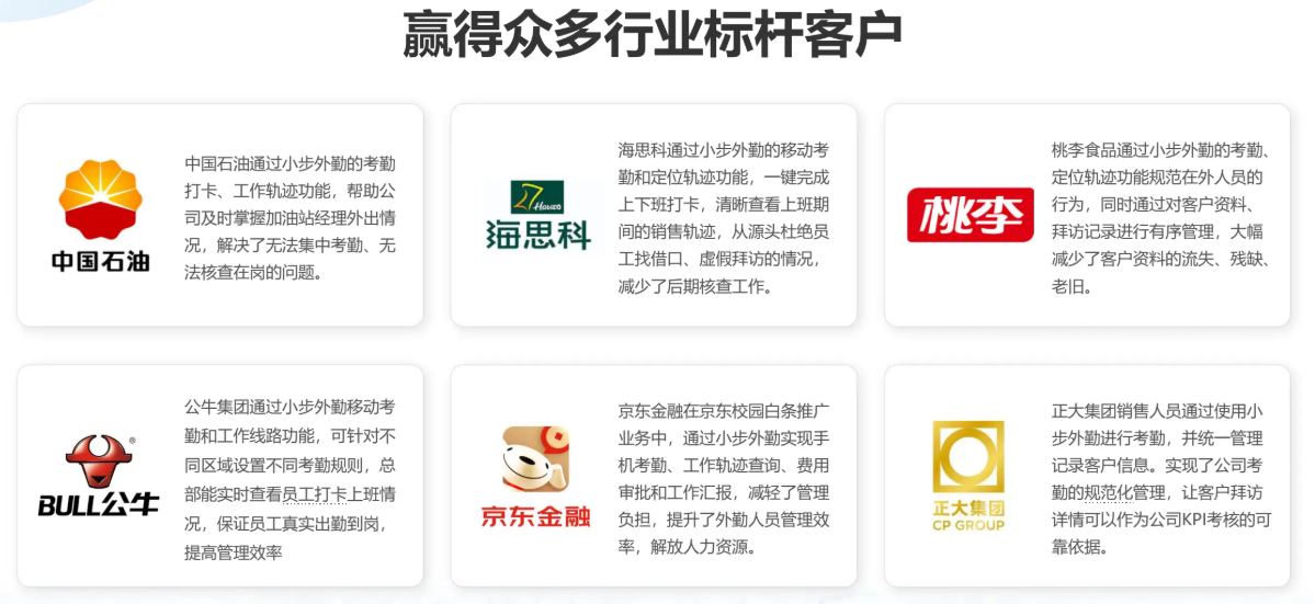 小步外勤已服务 80 多个行业,其巡店版在万余家名企中沉淀了大量成功实践。
